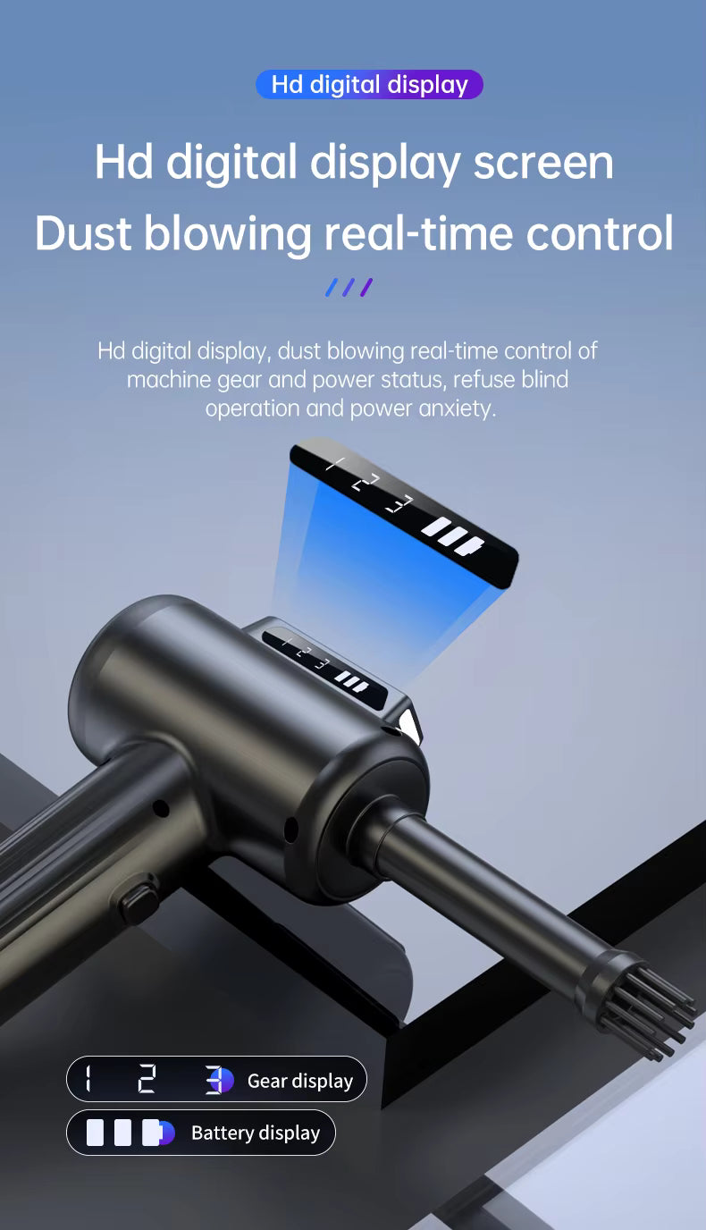 The built-in HD digital display gives you clear, real-time information about airflow levels and power settings. This allows you to adjust the dust blowing speed with precision, ensuring the right balance between gentle cleaning for delicate electronics and maximum power for stubborn dust. With smart monitoring at your fingertips, you have full control, efficiency, and confidence every time you clean.