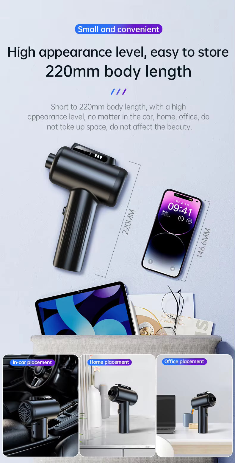 With a compact size of just 220mm, this device is easy to hold and use without feeling heavy or bulky. Its small design makes it convenient to store in a bag, office drawer, or car compartment without taking up much space. Despite its mini size, it still delivers powerful airflow and versatile functions. This sleek design makes it the perfect portable cleaning companion, whether at home, in the office, or on the go.