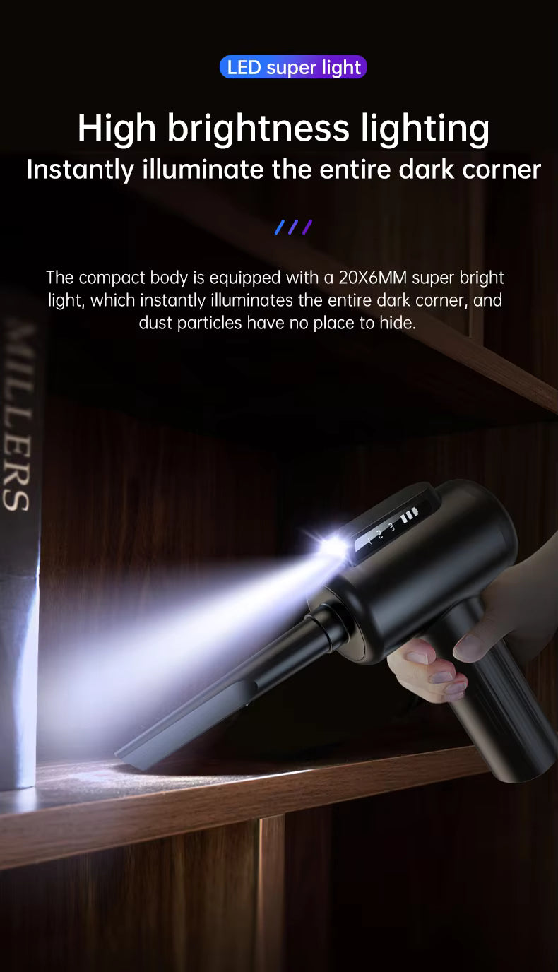 The built-in LED light makes cleaning easier and more effective, even in dark or hard-to-reach places. Whether it’s behind your computer, inside your car, or deep within a keyboard, the bright illumination ensures no dust or dirt is left behind. This feature is especially useful for night cleaning or low-light environments, giving you precision, accuracy, and a spotless result every time.